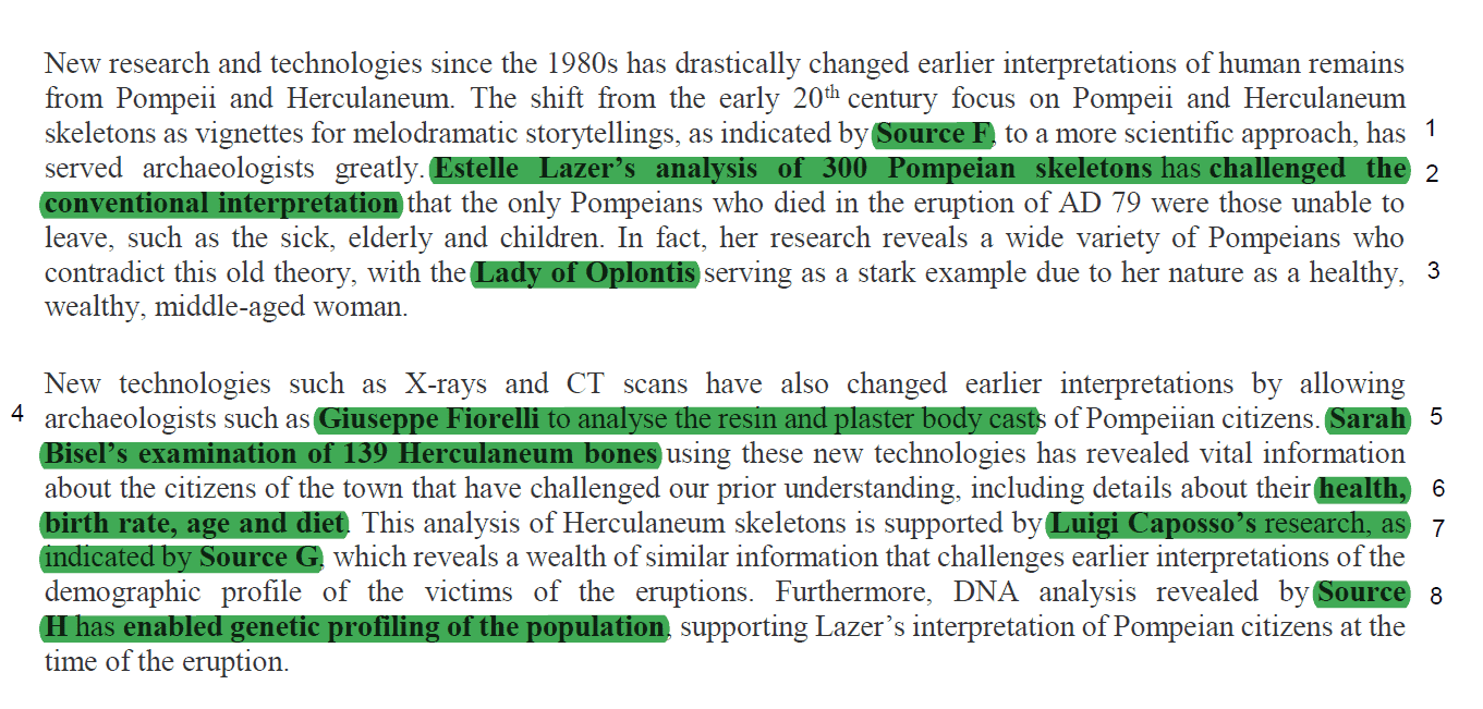 | Band 6 Response | Provides aninformed and comprehensive explanationofhownew research and technologies have changed earlier interpretations of human remains Integratesideas from Sources provided and own knowledge relating toboth Pompeii and Herculaneum Provides adetailed, structured responseusing arange of appropriatehistorical terms and concepts |