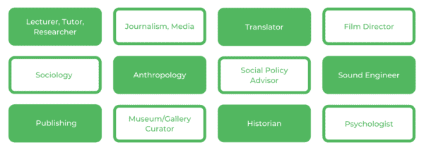 根据您的专业,您可以从中获取任何东西社会学家,工作出版那新闻或媒体,成为一个人类学家,是A.博物馆或画廊馆长、翻译、社会政策顾问、历史学家、电影导演、音响工程师或心理学家!