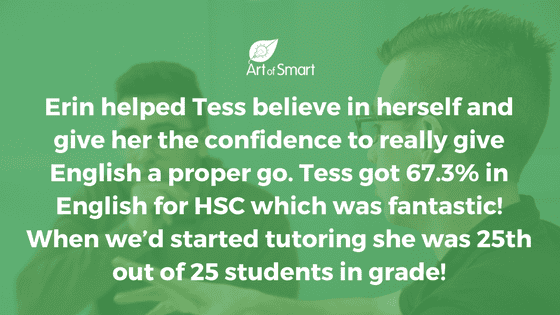 Erin helped Tess believe in herself and give her the confidence to really give English a proper go. In the end Tess got 67.3% in English for HSC which was fantastic! When we’d started tutoring she was 25th out of 25 students in grade and was not doing well.