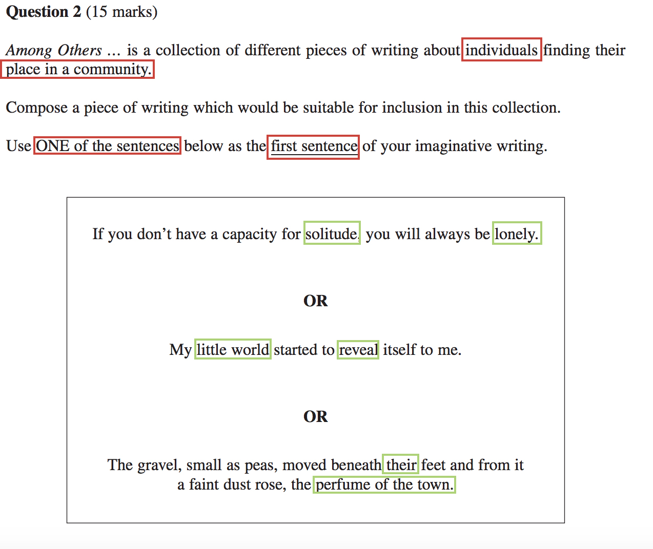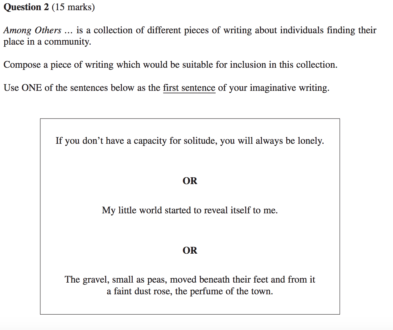 This question is asking you to develop a creative piece that focuses on one or two characters and how they found a place in some form of community. It also wants you to use one of the stimulus sentences as your opening, so make sure you use it in a significant way.