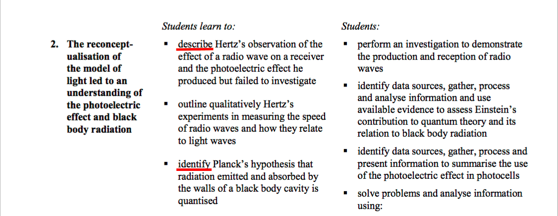 然而,如果我们看一看黑体辐射and Planck’s hypothesis, you’ll notice the syllabus says:identify. Quantum mechanics is incredibly weird and wonderful, but it’s also really hard! (As a quick aside, if you decide to go to university and study Physics, you won’t do this stuff until close to the end of your degree, it really can get quite complex!) NESA knows it’s hard and that’s why they just want you to just identify this is a solved problem. You aren’t expected to understand why introducing Planck’s constant fixes the problem, just that it does.
