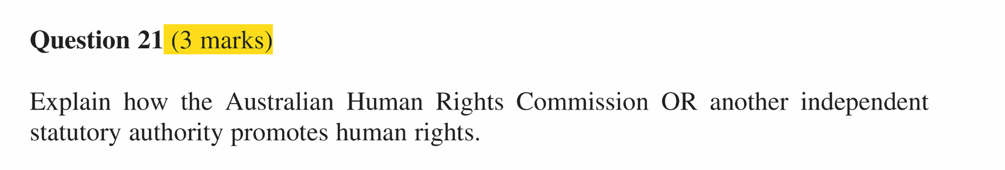 In this question, I would list 2-3 processes of the AHRC or another independent statutory authority, and link each one to the promotion of human rights.