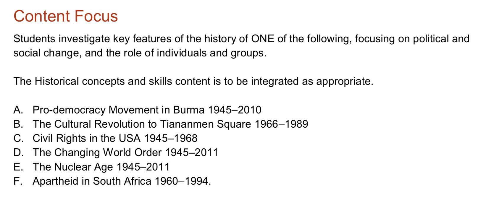 所有班级都必须学习至少有一个非西方的话题。这可能来自你的其他HSC现代史模块,或者你可能在这个模块学习非西方的主题。在模块中学习什么主题取决于你的学校。