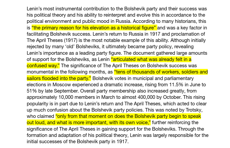 Take a lookatthis excerpt from a paragraphin response to the question“To what extent was Lenin responsible for the success of the Bolsheviks in the period 1917-1921?”from theRussia National Study.