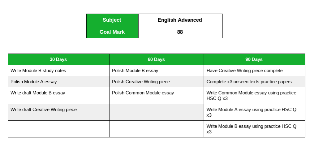 一个HSC学习计划映射到为每个主题做准备为您的HSC试验做准备的所有事情,随着时间的推移,您需要完成时间。