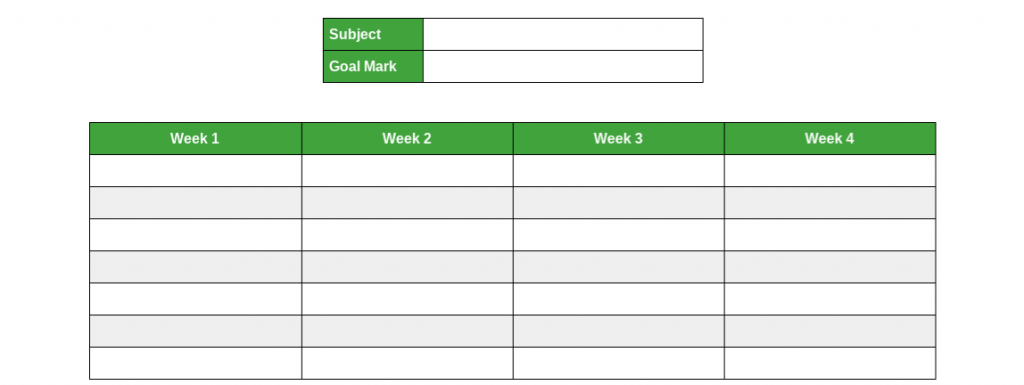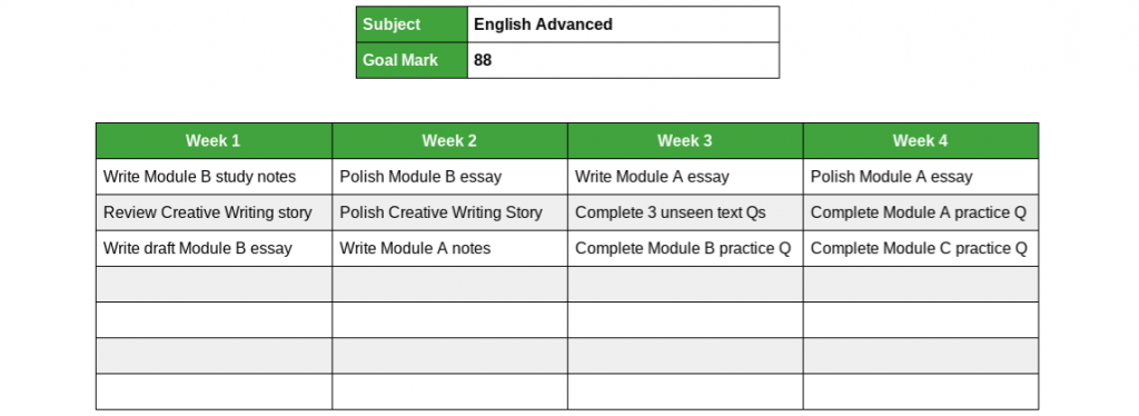 Now take 10 minutes for each column to write a to-do list for everything you need to for that particular subject over the next 4 weeks to give you the best shot of scoring your goal mark that you’ve written at the top of the page!