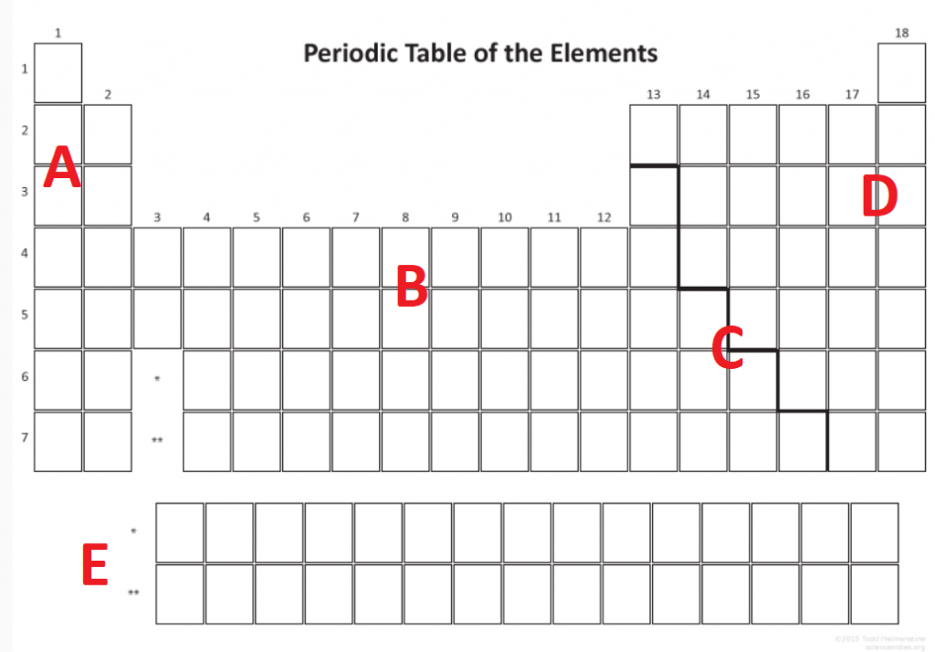 根据问题5中的元素周期表,在下表中列出A、B、C和D元素的至少2个物理和2个化学特征: