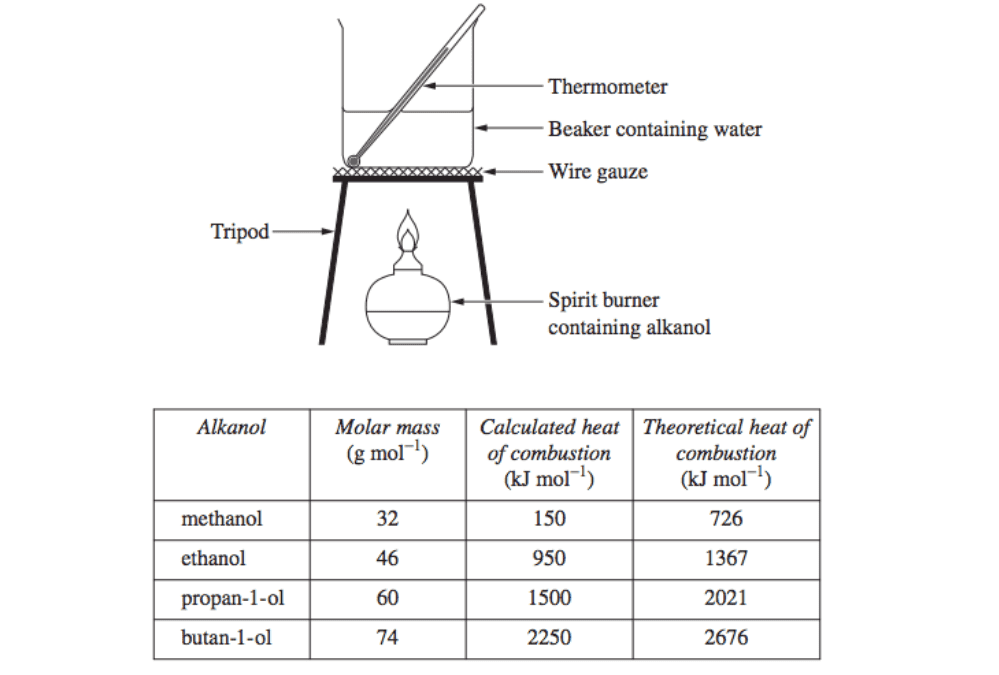 A student performed a first-hand investigation to determine the quantitative relationship between heat of combustion and molar mass of alkanols. The student did this by burning different alkanols to heat water as shown in the diagram below. The calculated heats of combustion for four of the alkanols are given in the table.