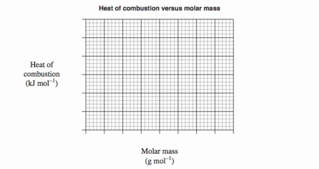 a) On the grid below, graph both the calculated and the theoretical heat of combustion against the molar mass of the alkanols.