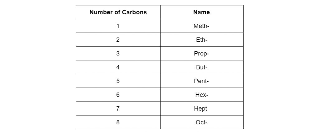 第一步是记住含有1个碳原子、2个碳原子等的化合物的名称。下表总结了这一点: