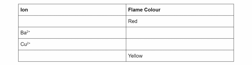 用正确的离子和它的火焰颜色完成下面的表格(4标记)