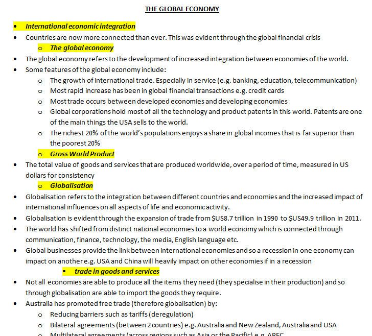 您的学习笔记应来自HSC经济学教学大纲。这使您可以确保涵盖了所需的一切。同时,它为您的笔记提供了清晰简洁的结构。