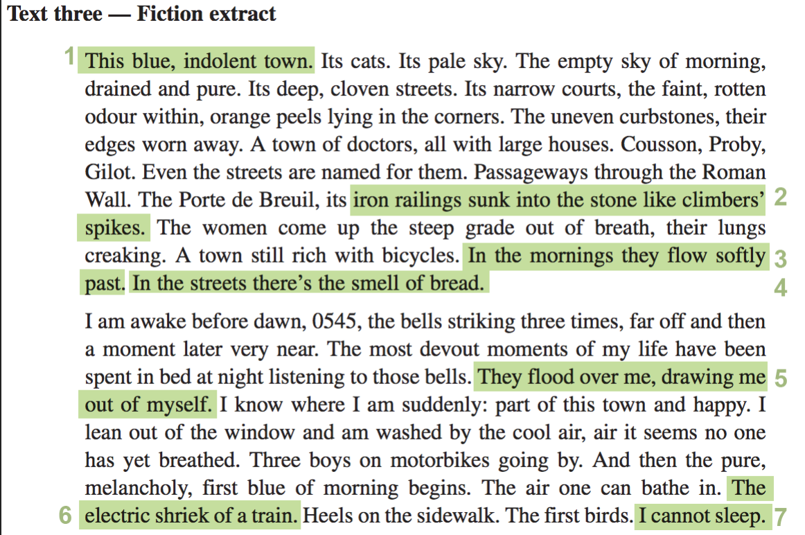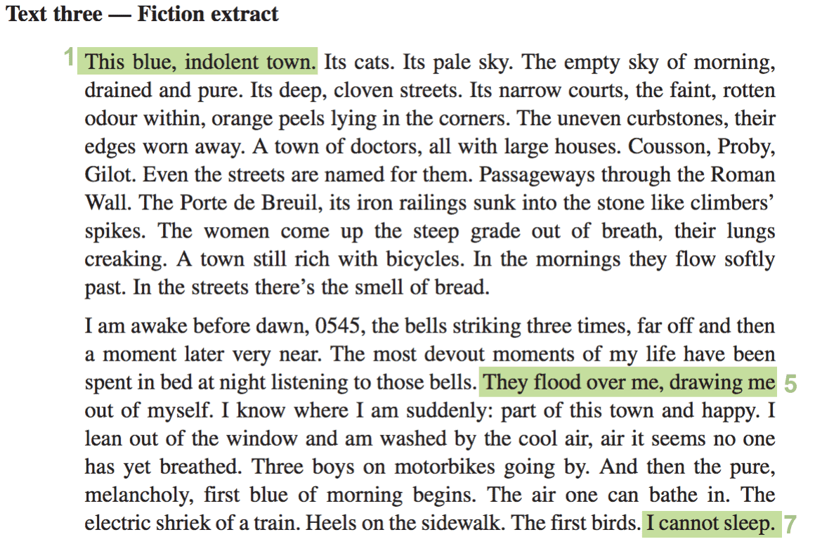 Here we’ve highlighted all of the strong techniques in the text that could be commented on in our analysis.