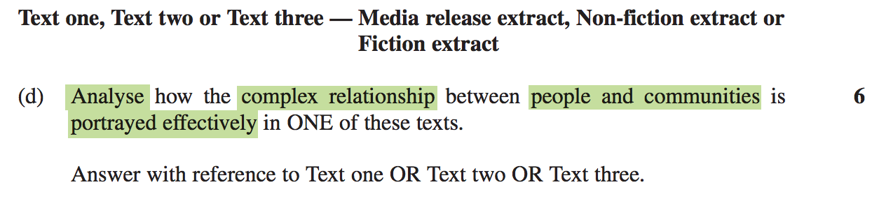 Analyse:The markers are looking for you to use techniques from the text to break down what the text is actually saying. The best way to tackle the example is by using the ‘TEE’ method to show how the text represents an overall idea.