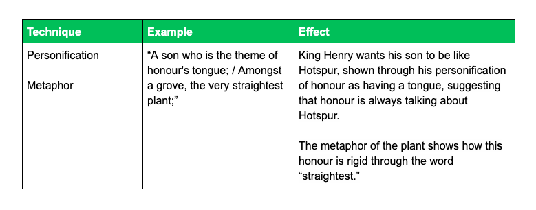 戏剧始于亨利国王的渴望,即“荣誉般的儿子”,就像Hotspur一样,使荣誉化并使Hotspur帕拉贡成为了荣誉。他使用了第二个隐喻,表明了这一荣誉的僵化,并说:“在树林中,最直接的植物。”