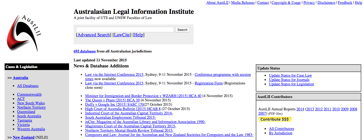 AustLII是澳大利亚最大的公共法律数据库。他们提供了立法、案件(法院判决)和报告。