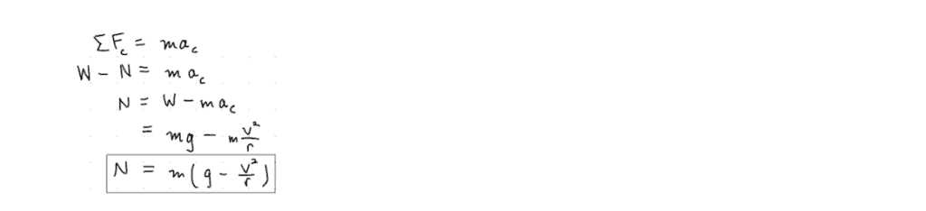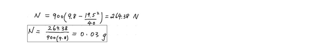 A (900 kg) race-car drives over a rounded hill section (radius of curvature: 40 m) at 70.2 km.h-1. Determine the magnitude of the normal force, N, on the car, at the apex (in g’s).