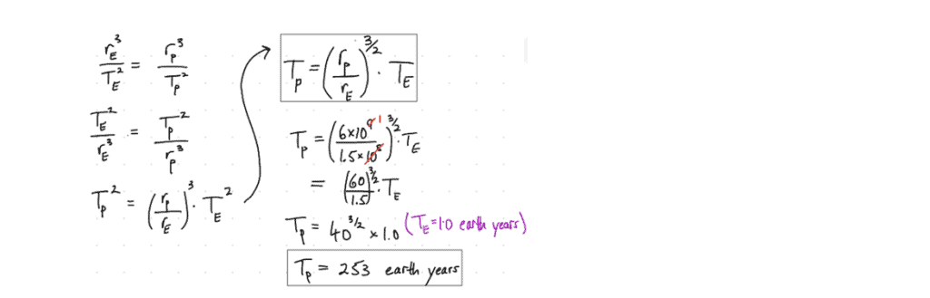 Use the fact that the average Earth-Sun distance is about 1.5 × 108km to determine the orbital period of Pluto (average orbital radius: 6 × 109km) in Earth years.