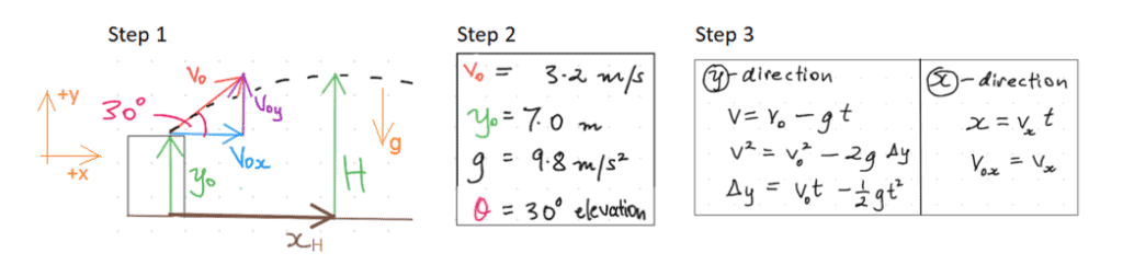 A catapult launches a 2.0 kg rock at 3.2 m/s, 30° elevation, from a 7.0 m high rooftop. How far will the rock have travelled horizontally by the time it’s at the top of its flight?