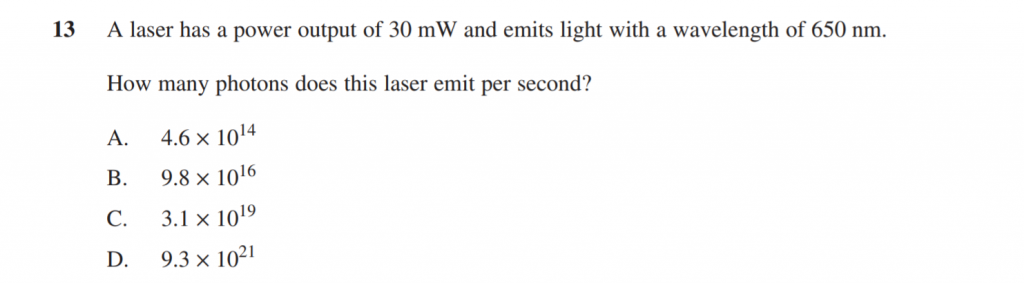 Here’s what a multiple choice question looked like from the 2019 HSC Physics Exam: