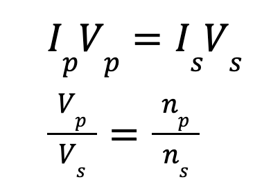 WhereI represents current, V represents voltage and n represents the number of turns。这subscripts p and s represent primary and secondary, respectively, and are a way of representing either the primary or secondary coil of the transformer.