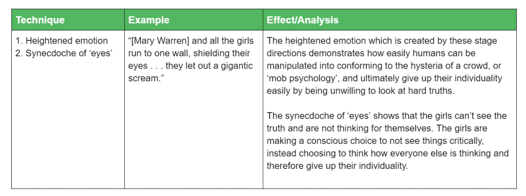PLUS we’ll provide you with a sample analysis table (also called a TEE table) and a sample Band 6 paragraph for The Crucible!